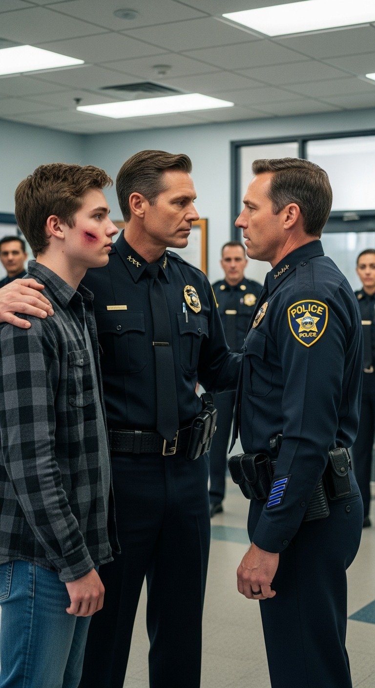 My son called from the police station: “dad, my stepdad beat me and filed a false report. the officers believe him.” i asked which officer—“sergeant miller.” i said, “stay put. twenty minutes.” i didn’t call a lawyer. i walked in wearing my uniform. the sergeant went pale. i calmly asked, “give me fifteen minutes alone with his stepdad.” the room froze…