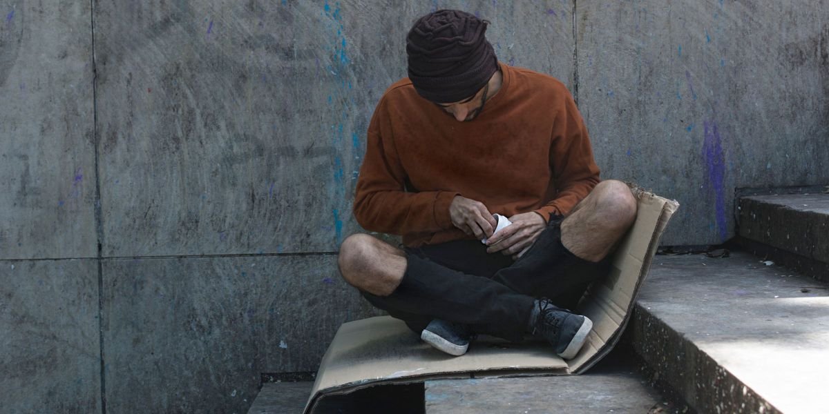 A homeless man sat near the alley by the pharmacy wall. His beard was thick, and his coat was worn thin. A paper cup rested beside his boots.